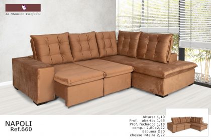 Estofado Madri. Largura: 2,4m (podendo ser de 2,10m a 3m) Altura: 1,08m Profundidade aberto: 1,70m Profundidade fechado: 1,15m Com molas ensacadas.